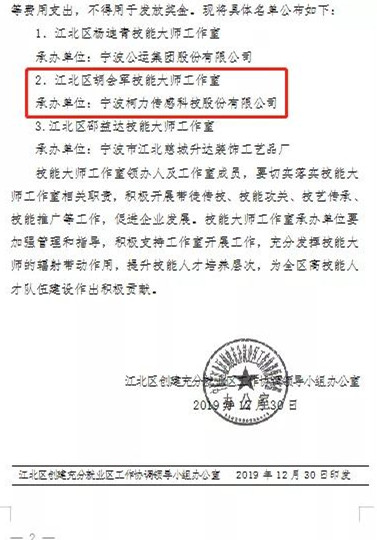柯力“胡會軍技能大師工作室”入選2019江北區(qū)技能大師工作室名單