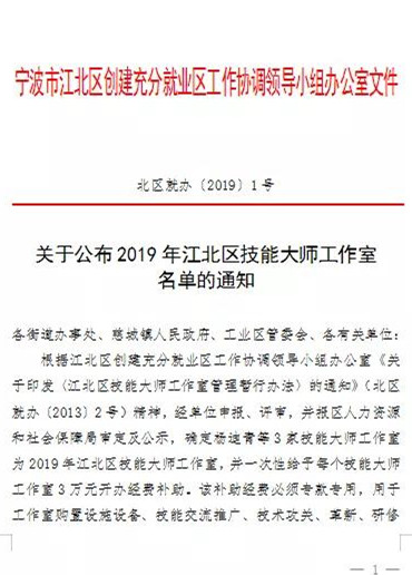 近期“2019江北區(qū)技能大師工作室名單” 公布,公司“胡會軍技能大師工作室”入選名單中的三家單位之一。每家工作室將獲得3萬元經(jīng)費(fèi)補(bǔ)助,用于工作室購置設(shè)備、技術(shù)交流推廣、技術(shù)攻關(guān)、革新、研修。